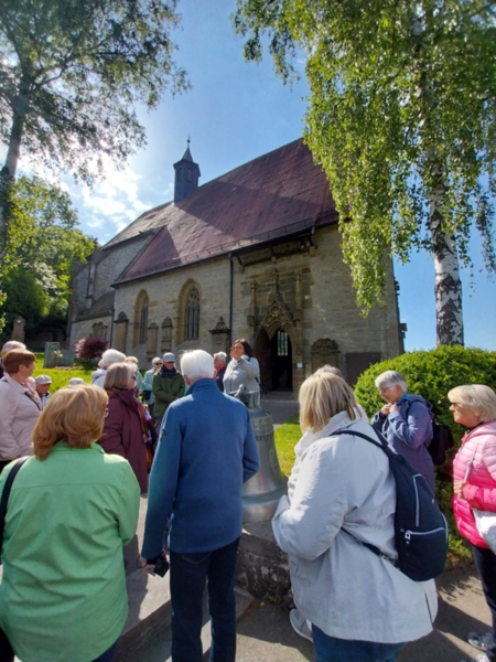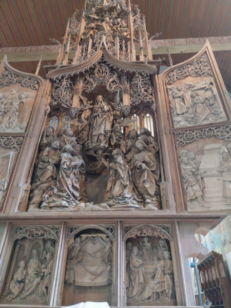 Nach einer launigen Begrüßung durch die Vorsitzende des Heimatvereins und Erste Bürgermeisterin Erika Hütten steuerte Sven den modernen Reisebus entlang der Aisch und weiter auf der Romantischen Straße zum ersten Etappenziel, der Herrgottskirche bei Creglingen. Sie beherbergt ein Kleinod fränkischer Schnitzkunst, den um 1500 von Tilman Riemenschneider angefertigten Altar mit seinen detailreichen biblischen Szenen. Auch die weitere Ausschmückung des Kirchleins zeugt von der Frömmigkeit ihrer Bauherren.