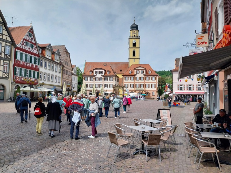 Nach der ausgiebigen Essenspause und ein paar Kilometer weiter fand sich die Reisegesellschaft schon bald im Zentrum der historischen Altstadt von Bad Mergentheim wieder, dem Mittelpunkt der Region Tauberfranken. Zwei Stadtführer gaben der geteilten Gruppe umfassende Einblicke in die Geschichte des badischen Kurortes. Durch die Schenkung der Grafen und späteren Fürsten von Hohenlohe 1219 an den Deutschen Orden begann die Blütezeit des Städtchens. Das markante schwarze Hochmeisterkreuz ziert noch viele historische Gebäude.